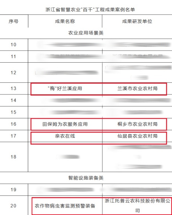 近日,浙江省農(nóng)業(yè)農(nóng)村廳公布了2023年度浙江省智慧農(nóng)業(yè)“百千”工程成果案例。其中,由浙江托普云農(nóng)科技股份有限公司(下稱“托普云農(nóng)”)自主研發(fā)的“農(nóng)作物病蟲害智慧測(cè)報(bào)系統(tǒng)”成功入選智慧設(shè)施裝備類案例;托普云農(nóng)全資子公司——浙江森特技術(shù)支撐建設(shè)的“梅”好蘭溪應(yīng)用、田保姆為農(nóng)服務(wù)應(yīng)用、親農(nóng)在線成功入選農(nóng)業(yè)應(yīng)用場(chǎng)景類案例。